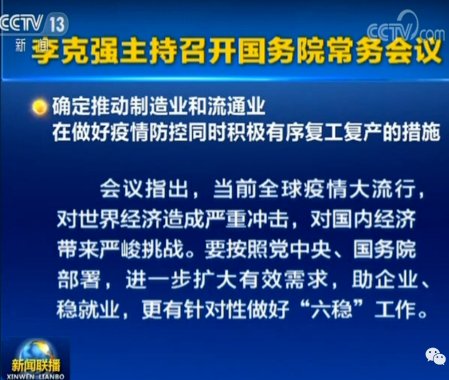 李克强总理3月24日主持召开国务院常务会议,确定推动制造业和流通业在做好疫情防控同时积极有序复工复产的措施。